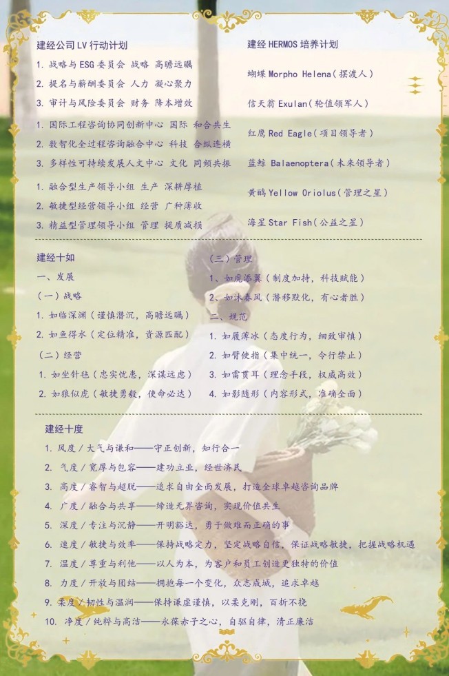 風度是企業的“外在名片”,如建經咨詢在國際化合作中堅守法律底線,同時敢于突破傳統咨詢模式(如成立律所、整合設計與造價業務),既保持專業嚴謹,又以開放姿態擁抱變革,形成“大氣而謙和”的行業形象。