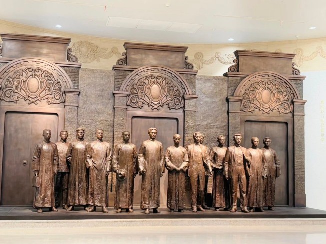 “開天辟地、日出東方”區(qū)域中央,“本黨定名為中國共產(chǎn)黨”的白銅雕塑還原了1921年7月23日的歷史性時(shí)刻:來自7個(gè)共產(chǎn)黨早期組織的13位代表,秘密聚集在上海法租界望志路106號(今興業(yè)路76號),召開中共一大。雕塑中,毛澤東雖手中無筆卻作握筆姿態(tài),且無論從哪個(gè)角度看都身形最高——這不僅因他實(shí)際身高,更以寫意手法寓意他將引領(lǐng)中國人民譜寫新篇章。