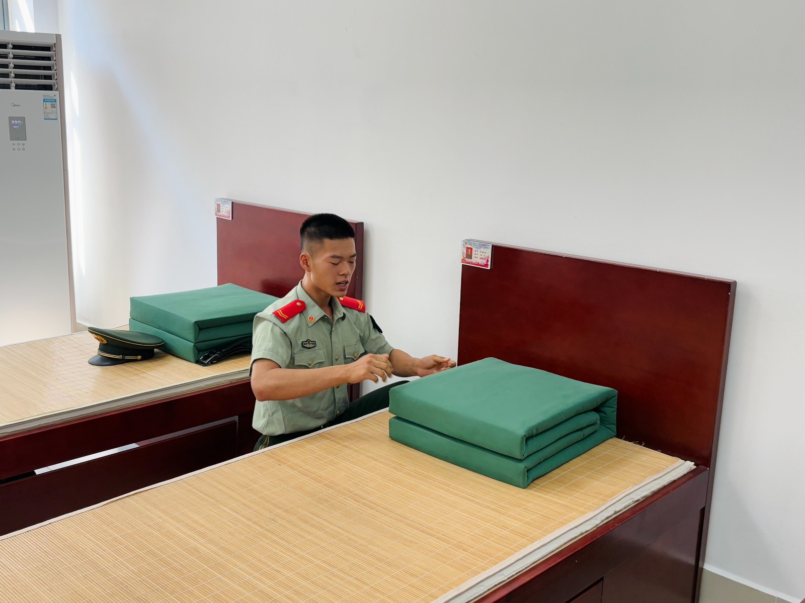 隨后,引導(dǎo)員帶領(lǐng)活動(dòng)人員參觀內(nèi)務(wù)室,戰(zhàn)士現(xiàn)場(chǎng)演示部隊(duì)內(nèi)務(wù)整理流程,其嚴(yán)謹(jǐn)自律的生活作風(fēng)令在場(chǎng)人員深受觸動(dòng)。在宿舍,戰(zhàn)士以 “鋪、折、曲、合、整” 五步法演示疊軍被:先將軍被鋪開并規(guī)范對(duì)折,對(duì)準(zhǔn)折痕后細(xì)致處理內(nèi)部棉花以防褶皺,再精準(zhǔn)確定角度與位置完成折疊,最后耐心修整,使軍被呈現(xiàn)出方正整潔的形態(tài)。戰(zhàn)士提到 “被子三分靠疊,七分靠整”,強(qiáng)調(diào)日積月累的重要性,這與軍事訓(xùn)練中 “無長(zhǎng)年累月摸爬滾打,難練出克敵制勝本領(lǐng)” 的道理一脈相承,讓在場(chǎng)人員直觀體會(huì)到部隊(duì) “細(xì)節(jié)見作風(fēng)、堅(jiān)持成習(xí)慣” 的嚴(yán)謹(jǐn)態(tài)度。